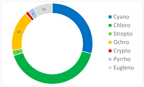 General phytoplankton species composition in nine shallow Bulgarian wetlands sampled in August 2019. The number of identified taxa in each phylum is shown. Legend: Cyano—Cyanoprokaryota, Chloro—Chlorophyta, Strepto—Streptophyta, Ochro—Ochrophyta (incl. classes Bacillariophyceae (diatoms)—28, Chrysophyceae (golden algae)—4, Xanthophyceae (yellow-green algae)—5, Eustigmatophyceae −1, Crypto—Cryptophyta, Pyrrho—Pyrrhophyta and Eugleno—Euglenophyta.