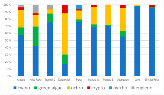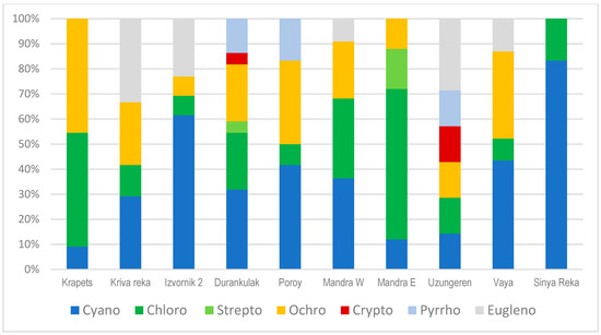Relative contribution of different taxonomic groups to phytoplankton biomass, obtained by light microscopy, in the phytoplankton of the studied Bulgarian water bodies (August 2019). Legend: Mandra W—western part of the reservoir Mandra, Mandra E—eastern part of the reservoir Mandra; Cyano—Cyanoprokaryota, Chloro—Chlorophyta, Strepto—Streptophyta, Ochro—Ochrophyta (mainly diatoms), Crypto—Cryptophyta, Pyrrho—Pyrrhophyta and Eugleno—Euglenophyta.