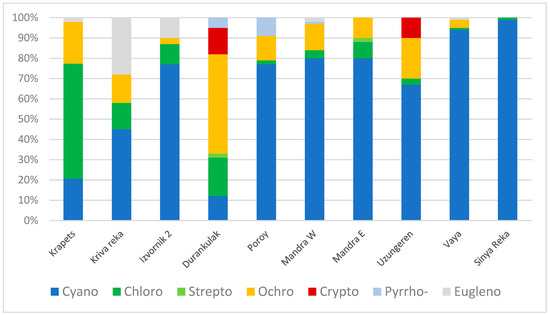 General phytoplankton composition according to the pigment markers analyzed by HPLC (expressed as percentage contribution to chlorophyll a, calculated using CHEMTAX) in the studied Bulgarian water bodies (August 2019). Legend: Mandra W—western part of the reservoir Mandra, Mandra E—eastern part of the reservoir Mandra; cyano—cyanoprokaryotes, green algae—chlorophytes and streptophytes, ochro—ochrophyta (incl. diatoms and golden algae), crypto—cryptophytes, pyrrho—pyrrhophytes and eugleno—euglenophytes.