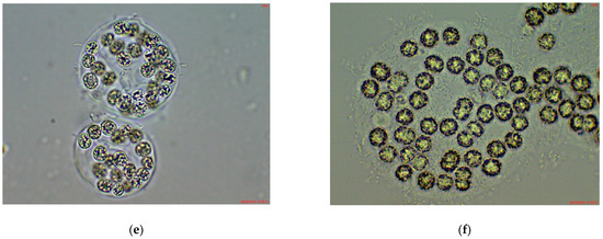 Examples of Microcystis from different Bulgarian waterbodies (under immersion and objective 100×): (a)—M. wesenbergii from the reservoir Sinyata Reka; (b) —M. aeruginosa from the reservoir Sinyata Reka; (c) —M. aeruginosa from the reservoir Mandra (Eastern part); (d)—M. wesenbergii from the reservoir Poroy; (e)—M. wesenbergii from the lake Durankulak; (f)—M. wesenbergii from the reservoir Izvornik 2.