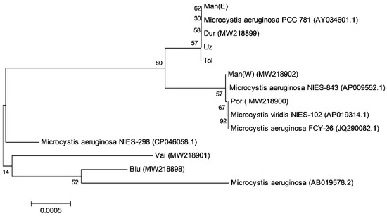 Up-to-now it was also not possible to affiliate with certainty to any species the six sequences of 100% homology with NCBI, namely Vai1, Vai4, Vai5, Por1, ManW4 and Dur 6 (Figure 7). However, according to the presence of NCBI strain Microcystis sp. Brat12/07-7 (NCBI:txid1402954), similarity with which was found in 2018 [9], we provisionally suppose that one of the six strains mentioned above, namely Dur 6, is similar with the strain of Microcystis natans (observed by LM in the same waterbody—Durankulak in 2018 [9] and submitted by us to NCBI as Uncultured Microcystis sp. clone Dur2_6 (MN417106.1).