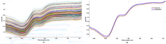 The NIR spectra of all the analyzed samples are displayed in Figure 1a, while, in Figure 1b, the average profile for the authentic and adulterated samples are plotted in red and blue, respectively.