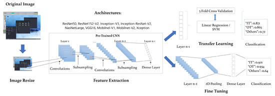 We modified and evaluated several pipelines based on transfer learning and fine-tuning, which use resized screenshots of ICSs as input. On the one hand, in transfer learning, we used a pre-trained CNN architecture for extracting features, which were then fed to a classifier trained in three image categories: OT, IT, and others. On the other hand, we performed fine-tuning on a newly defined head of the model of the CNN architecture to automatically classify an image into the three previous categories. Using nine different CNNs, we trained three classifiers applying both transfer learning and fine-tuning techniques. After obtaining the classifier, we used it to label images in three categories: IT, OT, and others, according to the classifier’s confidence score. If it was below a certain threshold, in our experiments, the images were classified as Others. This third category helps identify additional clusters retrieved from the metasearchers, such as Internet of Things (IoT) images, which could be useful for adding future labels. For our experiments with the selected architectures, we only classified images as IT or OT, omitting the third category for performance purposes. Figure 2 presents an overview of the proposed systems for classifying screenshots.