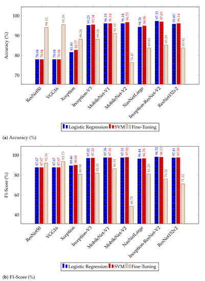 As for performance variance, ResNet50 and VGG16 obtained the least variance in both approaches for F1-score and accuracy, with and , respectively. In our logistic classifier, InceptionV3 obtained the largest variance of F1-score and accuracy with and , respectively, followed by NasNetLarge with and . On our SVM approach, the Xception architecture surpassed the variance of these two models, with F1-score and accuracy variances.