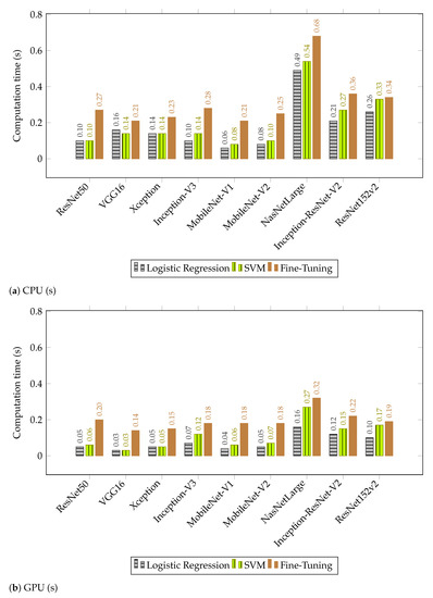 On average, the SVM classifier took slightly more time than the logistic regression approach, with the highest average increase seen in the NasNetLarge architecture from to on the CPU and to on the GPU. While the differences in most architectures between the two proposed transfer learning approaches are minimal, they can be critical in real-time systems.