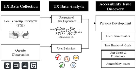 There are several methods of collecting user profiling data along with important factors—inaccessibility problems—to consider in advance, especially for the vulnerable yet inaccessible population. For example, when conducting a survey, the same questionnaires must be in various formats to meet the capability of users. It must be screen-reader-compatible for visually impaired users, neither verbose nor too complex for sign language users, less burdensome to answer for physically disabled users, and given in both manual and online formats for elderly users with lower ICT (Information and Communications Technology) ability [,,]. Other user research methods also have the same barrier issue. Interviews require a dedicated moderator to create adequate rapport to encourage participants to share their true experience with accessibility issues in detail []. It also requires a skillful sign language translator for interviewing deaf participants in addition to an experienced moderator [,]. Day Reconstruction Method (DRM) reduces participants’ burden of recoding episodes by imposing a chronological process only in a daily manner. However, it still requires highly systematic participation and engagement of disabled users to record their specific user experiences [,]. Most critically, it is challenging to recruit disabled and elderly users and to manage an interview or observation session. While taking into account all the considerable factors above, this study adopted the Focus Group Interview (FGI) and on-site observation methods.