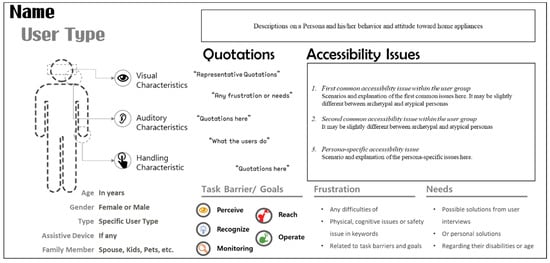 Furthermore, we developed personas for each group by the collected data from FGI and observation to highlight the user issues. When it is inaccessible for a manufacturer to obtain actual users’ needs and their behaviors toward a product, personas can be a great substitute for the target users because personas help stakeholders to empathize with their user with more profound understanding [,,] and are especially useful when it is challenging to recruit the target users []. A persona is a realistic but fictitious individual user that represents the target user’s characteristics, needs, behaviors, objectives, and expectations [,]. Personas based on user research can help manufacturers recognize and empathize with the needs in accessibility for people with disabilities since the personas define not only the users and user characteristics but also the problems they experience throughout given scenarios. The personas are presented in the form of a designer’s language rather than cold, unempathizeable tables and charts.