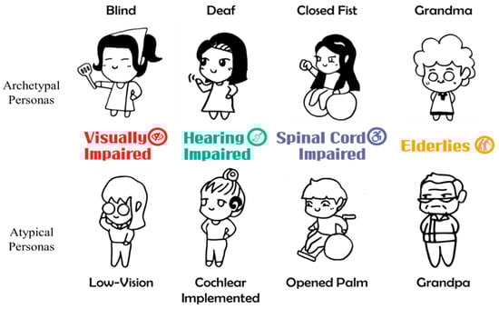 We developed a total of eight personas covering the four target user groups of visually impaired, hearing impaired, spinal-cord-impaired, and elderly people. In the results, each group has two personas representing remarkable differences within the group: one for an archetypal case and the other for an atypical case. In other words, one persona in a group represents a well-known or often-considered case of disabilities or elderlies, while the other represents the case that may be considered rarely. Hence, the archetypal personas are blind, deaf, closed-fist, and grandma personas, whereas the atypical personas are low-vision, cochlear implemented, opened-palm, and grandpa personas, as shown in Figure 4.