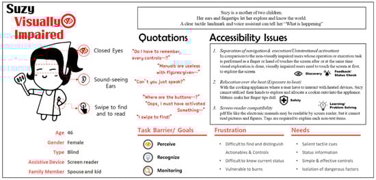 As mentioned above, each persona is represented in a form of a persona card. For example, Ms. Suzy is the archetypal visually impaired persona representing the blind users. As shown in Figure 5, Her persona card describes who she is on the left: her physical characteristics and how she uses them, an assistive device she uses, and family members. On the right side are her behavior and attitude toward home appliance usage along with a relevant quotation and accessibility issues. Her task barriers and goals are expressed iconically in terms of IEC 63008 tasks, in her case, they are perceive, recognize, and monitoring.