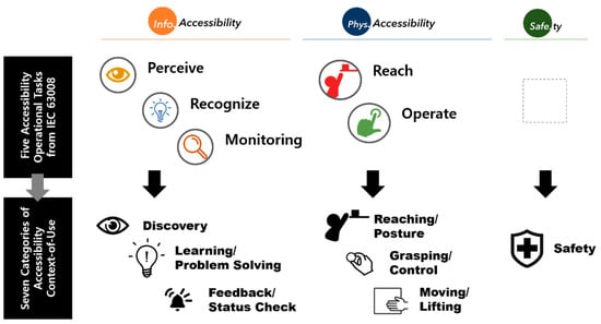 As we scrutinize the issues of each persona to categorize them, there was a need to expand the five accessibility issues in the following seven terms: (1) discovery, (2) learning/problem-solving, (3) feedback/status-check, (4) reaching/posture, (5) grasping/control, (6) moving/lifting, and (7) safety. We used these seven terms representing the accessibility context-of-use shown in Figure 7 to categorize the accessibility issues. Their names are more task- and context-oriented and self-explanatory than those of IEC 63008 tasks.