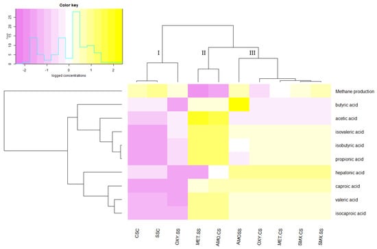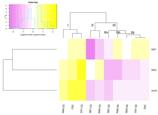 The influence of antibiotics on changes in the methanogenic community in the samples is well illustrated by the Ward method based on gene concentrations determined in the qPCR assay (Figure 4). Three main clusters were identified. In the case of SS, the heatmap shows that the highest differences compared to the control (SSC) were observed in MET SS and AMO SS, which formed clusters IIIa and IIIb, respectively. Moreover, cluster II included MET SC and AMO SC. Exposure of CS and SS to MET and AMO caused the greatest changes in the concentrations of genes that are characteristic of the methanogenic community. In Figure 1 discussed above, among others the distinctness of MET SS and AMO CS is visible. However, the present analysis clearly distinguishes four process bioreactors, both SS and CS exposed to MET and AMO. This may indicate that both MET and AMO had the greatest impact on the disturbance of the AD efficiency in both substrates by its characteristic microbiota, although the production of methane itself would indicate a distinct inhibition of the process by MET in the case of SS, and by AMO in the case of CS. Interestingly, SS OXY and SSC were in a common cluster (IIIc), as were CS OXY and CSC (cluster I). However, the exposure of both SS and CS to OXY was manifested by a significant reduction in the efficiency of methane production, in comparison to the proper control (Table 2). It is noticeable once again that the concentrations of the genes that are characteristic of methanogenic microorganisms, do not reflect the actual production of methane in bioreactors. In conclusion, while evaluating the effectiveness of methane fermentation, it is important to supplement the analysis of the process parameters with an additional analysis using molecular methods. Furthermore, the dominance of the SS digestate samples by the MST genes, and the CS digestate samples by MSC genes can be seen on the heatmap, as reflected also in Figure 2C–F. Considering the above, perhaps Methanosaetaceae dominant in SS is more sensitive to MET, while Methanosarcinaceae dominant in CS is more susceptible to inhibition by exposure to AMO.