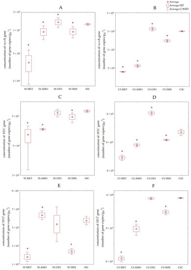 Furthermore, an analysis was made of the presence of statistically significant differences in concentrations of the mcrA gene between appropriate samples of SS and CS digestates (exposed to the same antimicrobial substance) and control samples SSC and CSC. Statistically significant differences (p < 0.05) were noted in each case (Figure 3). Importantly, the number of the mcrA gene copies in the CSC control sample ranged around 5.0 × 108 in 1 g of digestate (Figure 2B), whereas, in the SSC sample, this concentration was just 1.34 × 107 copies per gram of analyzed sample (Figure 2A), which was 37-fold lower. With these data, one might expect that the concentration and activity of methanogens in the CSC samples would be higher, which should result in a higher efficiency of the process. However, the results of an analysis of AD parameters (Table 2) demonstrated that the CH4 yield was higher by 72 L kg−1 VS in the SSC samples, not exposed to the presence of antimicrobial substances.
