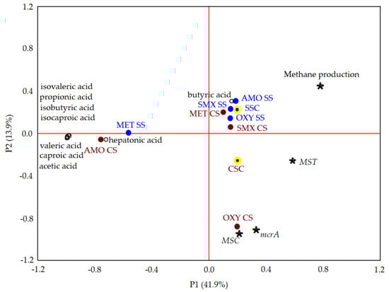 The research results therefore implicate that a decrease in the frequency of presence of mcrA gene copies was associated with the efficiency of biogas production, content of CH4 in biogas and concentration of VFAs only when samples were exposed to MET in the case of the SS substrate and AMO when CS was the substrate. These relationships were illustrated in a PCA diagram (Figure 3), which shows a positive correlation between the exposure of SS and CS to metronidazole (MET SS) and amoxicillin (AMO CS), respectively, and the VFAs accumulation. Moreover, a negative correlation with the production of CH4 and concentration of the mcrA gene is noticeable.