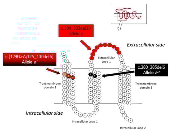 A detail of the 2D structure of the rabbit MC1R protein with indicated the amino acids that are eliminated by the three in-frame deletions that cause the ED (and/or ES; see the text), eJ, and e alleles at the Extension locus (modified from []).