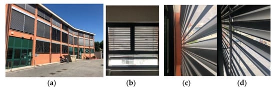 Example of a passive solar system, external adjustable blinds applied in the case study building: (a) external view, (b) interior view, (c) louvres detail, (d) connection detail.
