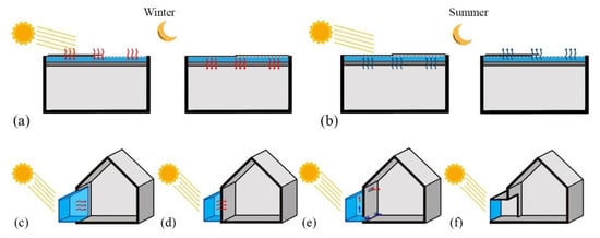 Water systems: (a) roof ponds winter mode (day and night), (b) roof ponds summer mode (day and night); sunspaces: (c) integrated, (d) attached, (e) attached ventilated, (f) sunporch.