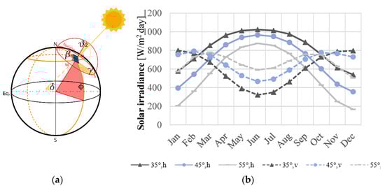 where is global irradiance on a tilted surface, is the solar constant, is angle between surface normal and incident radiation (Figure 4a) and represents atmospheric attenuation of solar radiation. Figure 4b reports the maximum daily solar irradiance per month at different latitudes.