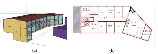 After a general investigation to quantify the impact of the different variables on the performance of the three kinds of passive solar strategies, another simulation was run to define possible effects of the synergy of different solutions on a case study of a real building. The aim was to provide a quantification of the energy saving that could be obtained with the design of passive solutions in an existing building. The selection of the case study has been influenced by various elements, as the positive effects of passive solar systems can be evaluated referring to both specific civil buildings for residential or public use. Between residential and public buildings, the latter result to be more energy consuming: daily use and commonly wide glazed envelopes make them also the most suitable kind of buildings for the implementation of passive solar systems. The European Directive 2010/31/UE [30], in fact, firstly focused its attention on public buildings, anticipating the requirement for nearly zero-energy buildings (nZEB) in new construction. For these reasons, the case study is based on the office building of the Department of Energy, Systems, Territory and Constructions Engineering of the University of Pisa, shown in Figure 6. The building hosts offices and research laboratories on two floors: the technical room for the building system at the ground level and the adjacent building with mechanical laboratories were not included in the simulation. It develops along the south-north axis, and is characterized by a wide glazed envelope, mainly equally east- and west-exposed with a gross window-to-wall ratio of 57.65%.