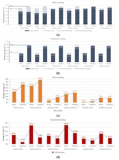 Results of the general investigation on the impact of variables over passive systems performance have been analyzed both in terms of absolute values and by comparing the percentages of energy saving achievable. Figure 9 shows the results of the simulation: in terms of energy demand, the difference between the two latitudes, as shown in Figure 9a,b, increased as the surface-to-volume ratio increases, moving from the office to the residential buildings. For the office building, direct systems proved to be the most profitable solution in terms of energy saving for both locations, as the highest savings, 28.2% and 38.5% for Rome and Frankfurt, respectively, occurred in the rotated direct system configuration, as described by Figure 9c. For the apartment building, Figure 9d, the Trombe wall rotated setting reached the highest saving in Frankfurt, 12.8%, and Rome, 22.3%. A very different trend can be defined for office and residential buildings in terms of passive system performance. Data collected confirmed that daily use office buildings prefer direct systems, as indirect and isolated systems showed much lower values. The trend highlighted an increase of the savings moving from Rome to Frankfurt, due to the higher demand of the Frankfurt facility that can better exploit solar radiation during its colder season, except for the sunspace simulation, and an increment from standard to rotated configuration certified the higher efficiency of south-faced passive solar systems. Quite the opposite trend can be detected in residential buildings, as the energy savings decreased from Rome to Frankfurt, and the variation among direct, indirect, and isolated systems percentages was lower. As in the previous analysis, however, the rotated configuration showed higher results for both locations, establishing again the higher performance of south-faced systems.