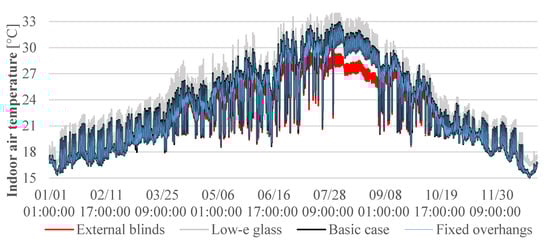 Moving to the case study of the office building, four different strategies have been studied and results are shown in Table 4. As a reference, the basic case, with no shading systems, determined an energy demand per total building area of 115.52 kWh/m2, with an almost equal energy consumption for heating and cooling purposes, 47.59 kWh/m2 and 45.66 kWh/m2, respectively. Due to the east and west exposure, the effectiveness of fixed overhangs was negligible, while the impact of external blinds to reduce the summer undesired heat gain while guaranteeing proper lighting levels for office work was relevant. The results show that while fixed shadings led to a very low energy demand variation, with only 1.28% energy saving in cooling, blinds cut off one third of the cooling energy demand, with an impact of 12.58% on total energy consumption. This result highlights the hidden potential of passive solar solutions that can provide a reduction in embodied and operational energy requirements over a life cycle [31]. As shown in Figure 10, indoor air temperatures in the office zone in free running conditions rise compared to the basic case due to the higher thermal resistance of the windows: results show a reduction around 15% in heating demand, but the lower heat losses during the night generated a higher demand of energy in the cooling season. The analyzed synergy effect of the combined strategies individually, external blinds and low-e glasses, reduced by around a quarter the energy demand of the building, with a share for heating and cooling close to the highest values previously detected, 14.91% and 32.74%, respectively.