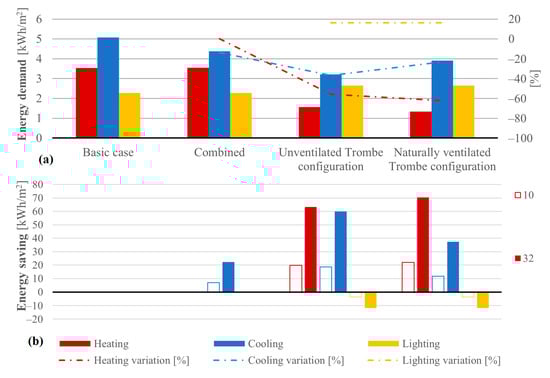 Regarding the investigation of the office module, as in the previous analysis, the combined case showed a higher share of energy savings on the cooling side, with a reduction of 13.78% of energy demand, and zero effect on heating for the single office module. Replacing half of the wall-wide window with a Trombe wall drastically reduced the heating demand, more than half of the required energy in the basic case and cut off one third of the cooling demand. Figure 11a shows the results of the simulations. The lighting load moved from 2.28 kWh/m2 in the full window configuration to just 2.65 kWh/m2 in the half-window one. The naturally ventilated indirect system reached a higher share of energy savings for building heating, around 62%, but without a proper control system, its integration could be counterproductive: the cooling energy demand, indeed, rose from 3.21 to 3.91 kWh/m2. This last configuration highlights the possible impact of an integrated passive solar design on building energy consumption, as the combined use of direct and indirect system could generate a reduction of 50% of a common office building’s energy demand: a higher share could be achieved taking into account ventilation, by exploiting the Trombe wall cavity as a solar chimney during the cooling season. Assuming the office module as a functional unit, we compared a 10-units building, as a benchmark of a small office facility, with the department building previously analyzed, which contains 32 office zones. Results in Figure 11b confirm the impact on cooling demand of the combined case, whereas neglectable energy savings in terms of heating demand have been achieved, thus implying that the reduction of heating load, around 15%, achieved in the whole building analysis was mainly related to common spaces and wide laboratories.