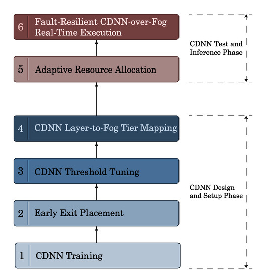The steps to be taken for the design, training, and execution of the CDNN with early exits of Figure 1a over the distributed Fog technological platform of Figure 1b are sketched in Figure 2. The first four steps of Figure 2 concern the training/setup of the considered CDNN with early exits. All these steps have been the focus of our previous contributions in Reference [7,15], and will not be further considered in this paper. The last two steps of Figure 2 concern the inference phase of the CDNN’s life-cycle and will be the explicit focus of this contribution.