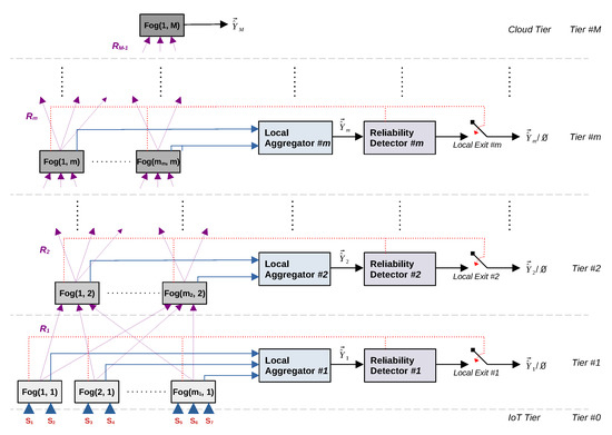 - the middle segment, where a number of spatially distributed and networked Fog nodes operates. According to Figure 3, this segment is hierarchically organized into stacked tiers numbered from to . At , with , a cluster: , with , of Fog nodes operates by exchanging data with a local aggregator over an intra-tier LAN. From time to time, the local generates a local decision (i.e., a class label) on the current input data generated by the sensors at when the confidence level of the per-tier aggregated data delivered by is high enough (see the dotted red lines in Figure 3). In the opposite case (i.e., when the confidence level of is estimated to not be high enough), the local output is the empty set: ∅, that is, no data is generated by the m-th local output;