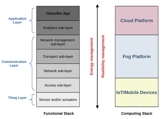 Finally, the protocol stack implemented by the envisioned architecture of Figure 3 is detailed in Figure 4. Specifically, the three-layered architecture of the simulated protocol stack of Figure 4 reflects the corresponding partition of the technological platform of Figure 3 into three hierarchically-organized main segments, namely: (i) the lower-most segment, at which the IoT devices operate; (ii) the middle segment, which embraces the clusters of Fog nodes; and (iii) the upper-most segment, where the remote Cloud works.