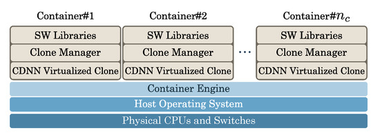 Hence, according to this consideration, we assume that all Fog/Cloud nodes of Figure 3 are equipped with software clones of the run CDNNs. The number of clones simultaneously hosted by each FN equates to the number of (possibly, multiple) CDNNs which are running in parallel over the technological platform of Figure 3. Doing so, each clone is fully dedicated to the execution of a single associated CDNN, and then it acts as a virtual “server” by providing resource augmentation to the tied “client” CDNN. For this purpose, each clone is executed by a container (CNT) that is instantiated atop the hosting FN. The container is capable of using (through resource multiplexing) a slice of the physical computing and networking resources of the hosting FN. The logical view of the resulting virtualized container-based FN is detailed in Figure 5.