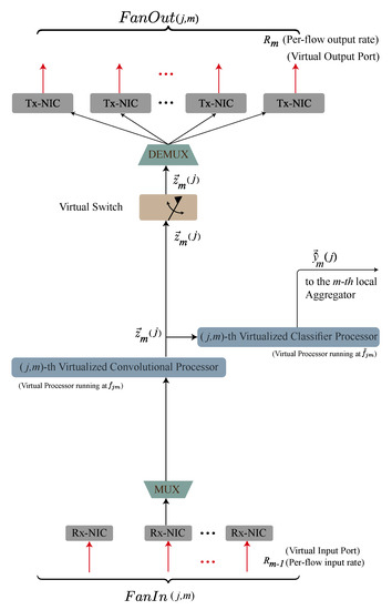 - the -th Virtualized Classifier Processor, running at frequency , provides the computing support for the execution of the local classifier of the CDNN. Its task is to process the feature vector generated by the corresponding Virtualized Convolutional Processor, so as to produce the output vector to be delivered to the corresponding m-th Local Aggregator of Figure 3 for the (possible) generation of an early-exit;