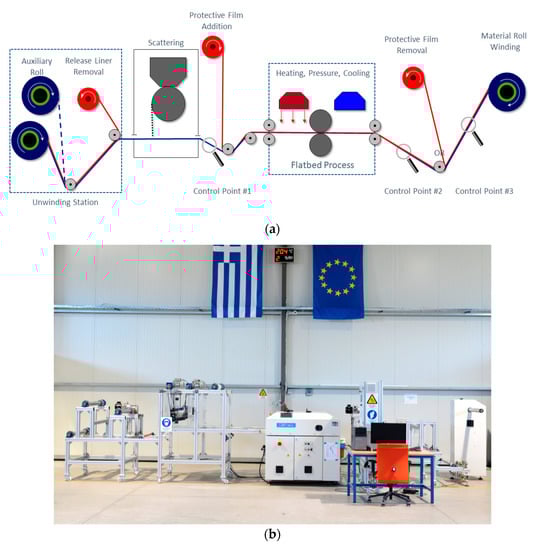 Following the manufacturing process used in the R2R pilot, a commercial prepreg in the form of a roll is positioned at the “Unwinding Station” (the beginning of the line) to retrieve a roll of functionalized prepreg at the “Winding Station” (the end of the line). The dopants have the form of a micro-powder, which is deposited by a scattering process at a specific amount on the prepreg substrate. Then this micro-powder is firmly integrated into the prepreg with the help of the temperature and the pressure of the “Flatbed Process”. The final product can either have or not have an extra protective film. The R2R pilot line process is based on a programmable logic controller (PLC) and its specifications are given in Table 1.