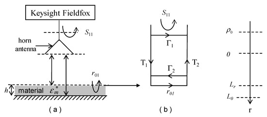 where is the dielectric constant and is the loss factor. We consider that the microwave response of conductive composite materials is mainly attributed to the wave reflection at the air to material interface. The complex reflection coefficient S11 measured by the VNA can be derived from the phenomenological flow graph given in Figure 2b where a two port error adapter is considered to relate S11 to the free-space reflection coefficient of the material under test r01 located at a reference distance Lr from the antenna aperture. The error terms Γ1, Γ2 and T1T2 correspond respectively to the directivity, source match and reflection tracking error terms. These three terms determined from a calibration procedure are used to derive the actual reflection coefficient r01. The term r01 defines the reflection coefficient at the interface air-material. By applying boundary conditions at the air-sample interface, it is found that this parameter is related to by