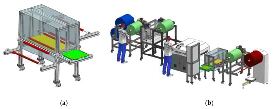 (a) CAD representation of the free-space quality module. (b) CAD representation of the dedicated module in position Control Point #2 of the R2R pilot line.