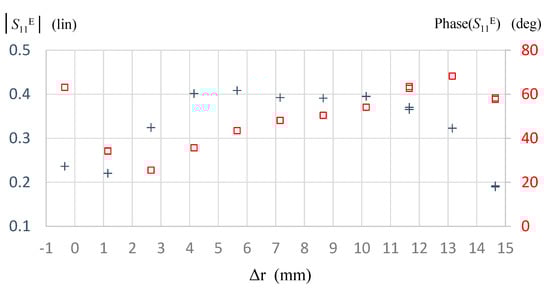 Measured empty free-space complex reflection coefficient as a function of the stand-off distance from the reference plane (Lr = 24.04 mm)—f = 10 GHz (+ amplitude│S11E│ and □ Phase of S11E).
