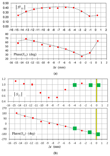 (a) Comparison between Modelled (---) and measured (●) empty free-space complex reflection as a function of the stand-off distance from the reference plane (Lr = 24.04 mm) – f = 10 GHz. (b) Comparison between Modelled (---) and measured (●) calibrated empty free-space complex reflection as a function of the stand-off distance from the reference plane (Lr = 24.04 mm)—f = 10 GHz. The reference plane is illustrated in yellow color (at = 0) and the calibration standards are illustrated with ■.
