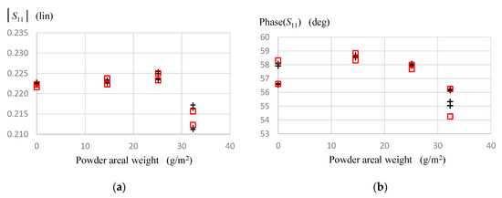Measured amplitude and phase-shift of the complex reflection coefficient as a function of the powder areal weight (+ First measurement round, □ Second measurement round)—f = 10 GHz.
