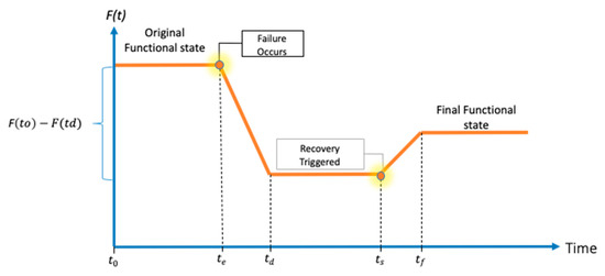The resilience concept can be better represented considering Figure 1 (adapted from [37]). This shows the behavior of a given performance metric (e.g., its functionality). This, over time, may suffer variations due to disruptive events. In one such event, performance suffers a significant decline in its level, to a minimum value. From that moment on, the functional performance begins to increase its value in time, until it reaches an “acceptable” level, indicated in Figure 1 as the final functional state.
