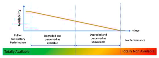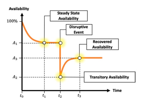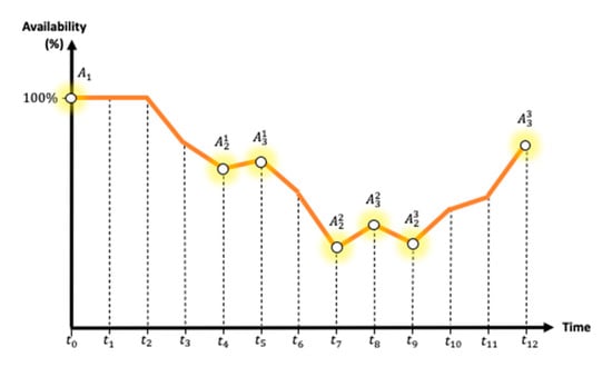 Here, represents the system’s availability and represents the equipment’s availability. As already mentioned, the model proposed by Cai et al. [12] is the unique evidence of an analytical model that relates the system resilience to the availability of the system in the presence of a given set of disruptive events. Considering Figure 5, we have Equation (2):