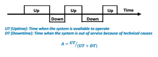 The first parameter, MTBF, is closely aligned with the concept of reliability, i.e., the probability of an asset to be operational at a certain point in time, while maintainability (MTTR) reflects the probability that the repair will take place in a certain period of time. Still in reference to Equation (1), it can be seen that if the reliability of an asset is reduced, availability will be affected. On the other hand, if the maintainability of the asset decreases, or it suffers a worsening, that is, the time to repair an asset increases, the availability of such asset will also be reduced. For this reason, to promote increases in availability at the system level, efforts must be deployed to improve the reliability of its constituent elements and install efficient and expedited repair procedures. Figure 3 explains the concept of availability in a graphic form.