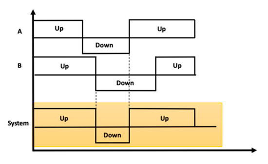 The availability at the system level is estimated taking into consideration the structure (topology) of the system. That is, in order to compute the value of systemic availability, the connections among different pieces of equipment (i.e., serial, parallel) or the existence of redundant or stand-by equipment, must be considered. For example, this can be observed in the time diagram in Figure 4, which reflects the up and downtimes in two pieces of equipment arranged in parallel.