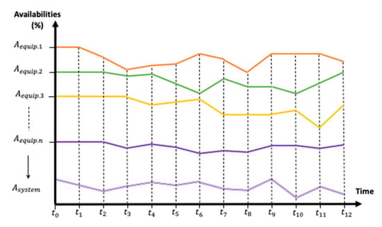 To the best of our knowledge, only one work [12] has proposed in an explicit manner the use of system-level availability as the parameter that allows performance evaluation in engineering systems. System-level availability reflects the relationship between the time a physical asset is available and the total or nominal time for operation. Availability is an important parameter linked to maintenance and its efficiency. This can be observed in Equation (1), in which the average times between failures and the average times to repair are related.