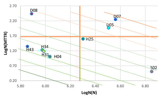 Figure 8 shows the Jack Knife diagram with the equipment selected as critical from Table 2, for each of the sub-fleets. We established as an assumption that these equipment items are the ones that most affect the resilience of the system. Therefore, they were selected for stage II of the study, i.e., the Monte Carlo analysis.