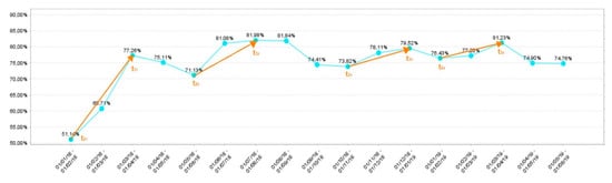 The analysis interval begins on 1 January 2018 and ends on 25 June 2019. The monthly systemic availability of the extraction fleet is shown in Figure 9. The occurrence of an external disruption, as well as the recovery period of availability at the system level, is represented by an arrow in the aforementioned figure. This goes from each local minimum to the next local maximum of the series.