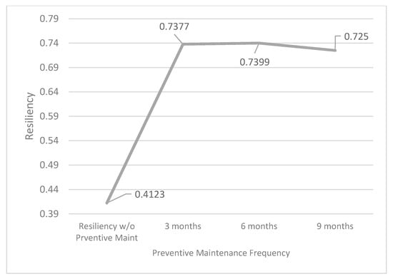 Regarding the proposed methodology, it was possible to identify where or how it is possible to positively influence the system resilience applying different preventive maintenance strategies. Moreover, it is feasible to prevent excessive maintenance activities that will not produce significant improvements in one of the system’s overall characteristics, such as resilience. In other words, a balance can be established between the maintenance strategy, and its resources, and the impact on the system’s resilience, based on the overall availability. Such balance can be affected over time, hence the importance of developing simulations or projections using Monte Carlo experiments to simulate the behavior of each reliability and maintainability parameter over time. This allows the incorporation of a useful element into the decision-making process with regard to the physical assets management.