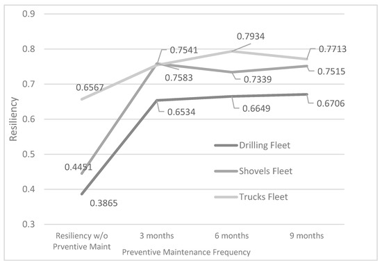 Resilience indexes of each sub-fleet with preventive maintenance in critical equipment.