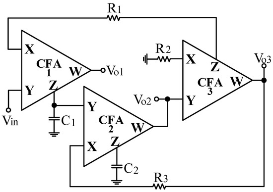 The circuit symbol of CFA is shown in Figure 1a. Using standard notation, IY = 0, VX = VY, IZ = IX, and VW = VZ can be used to characterize the port relationship of CFA [18]. Port Y has high-input impedance, and port X has low-input impedance. The input voltage of the X port follows the high-input impedance voltage of the Y port. Port Z has high-output impedance and the output current sinks the input port X current. Port W has low-output impedance and the output voltage follows the port Z voltage. The circuit symbol of AD844 is shown in Figure 1b. The port relationship of AD844 can be characterized by I+ = 0, V− = V+, ITz = I−, and VW = VTz [24]. The positive port has high-input impedance and the negative port has low-input impedance. The negative-port input voltage (V−) follows the high-input impedance voltage (V+) of the positive port. Port Tz has high-output impedance and the output current (ITz) sinks the negative-port input current (I−). Port W has low-output impedance and the output voltage (VW) follows the port Tz voltage (VTz). Hence, the characteristics of CFA are exactly equivalent to commercial AD844 IC. The proposed high-input impedance single-input triple-output VM multifunction biquad filter is shown in Figure 2. Figure 3 shows a practical implementation of CFA using AD844 IC. As shown in Figure 2 and Figure 3, the input voltage signal is applied to the high-input impedance Y or plus ports. Hence, the proposed circuit has a high-input impedance and can be easily cascaded to VM circuits. A routine analysis of Figure 2 gives the following three voltage transfer functions.