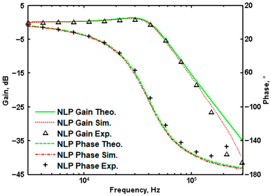 Experimental gain-frequency and phase-frequency voltage responses of the NLP filter.