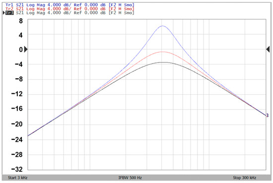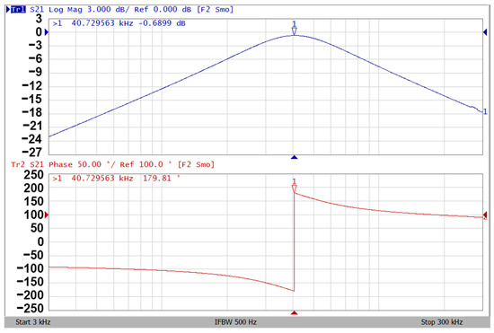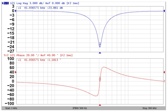 In order to confirm the theoretical study, the proposed circuit of Figure 2 was simulated using the AD844 macro-models of OrCAD PSpice version 17.2 and was experimented using commercial AD844AN of analog devices. The power supply voltage was given as ±6 V. The passive component values of the Figure 2 are given by R1 = R2 = R3 = 4 kΩ and C1 = C2 = 1 nF for the center frequency of fo = 39.79 kHz. Figure 4, Figure 5 and Figure 6 show the simulation and experimental gain-frequency and phase-frequency voltage responses for the NLP, IBP, and NBS filters of Figure 2, respectively. In the simulated NLP voltage response of Figure 4, the center frequency fo is 38.9 kHz, which is −2.23% different from the theoretical value. In the simulated IBP voltage response of Figure 5, the center frequency fo is 38.5 kHz, which is −3.24% different from the theoretical value. In the simulated NBS voltage response of Figure 6, the center frequency fo is 38.9 kHz, which is −2.23% different from the theoretical value. Figure 7 shows the different Q-values of IBP voltage response and the tunable Q-values, Q = 0.71, 1, and 2.5 are obtained without affecting the fo parameter. In Figure 7, R2 = R3 = 4 kΩ, C1 = C2 = 1 nF, and only vary the resistor R1 as 5.6, 4 and 1.6 kΩ. It is found that the total power consumption of the simulation is 255 mW. Figure 8, Figure 9 and Figure 10 represent the experimental frequency responses for the NLP, IBP, and NBS voltage responses of Figure 2, respectively. In the measured NLP voltage response of Figure 8, the center frequency fo is 41.364 kHz, which is 3.96% different from the theoretical value. In the measured IBP voltage response of Figure 9, the center frequency fo is 40.729 kHz, which is 2.36% different from the theoretical value. In the measured NBS voltage response of Figure 10, the center frequency fo is 41.036 kHz, which is 3.13% different from the theoretical value. The experimental gain-frequency voltage responses of the IBP filter with difference Q-values is shown in Figure 11. Figure 12 shows the experimental measurement result of the IBP transient response of the 40 kHz frequency and 2 V peak voltage of input voltage signal. It can be seen from the simulation and experimental results that they are consistent with the theoretical values.