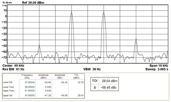 The 1-dB compression (P1dB) point is a key metric to determine the linear region of the circuit’s operation. This point represents that the input power reduces 1 dB gain from the normal linear gain specification. In general, there is nonlinearity in the transfer functions of all electronic circuits, and nonlinear distortion occurs. Hence, the third-order intercept (TOI) point measurement is a good indicator of the depth of distortion created by intermodulation products. Figure 13 and Figure 14 show the measurement results of the P1dB and the TOI point, respectively. The measured input P1 dB point is 18.8 dBm and the measure TOI point is 29.04 dBm.
