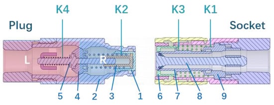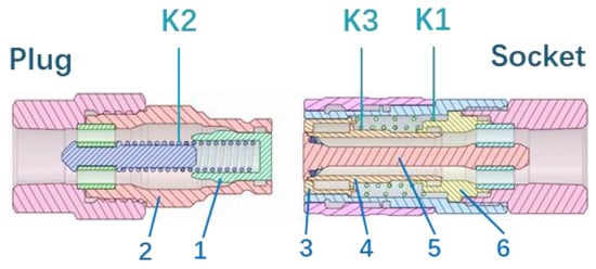 Figure 4 shows the internal mechanism of the NFFCS. Compared to the CFFCS, the main difference lies in the design of the plug connector. Valve (4) and pin valve (5) divide the plug into the L and R chambers, where the high pressure hydraulic oil is completely sealed in the L chamber due to the pressure acting on the valves. The valve (1) in chamber R has no fluid pressure acting on it, which means that opening this valve (1) requires us to overcome only the spring resistance.